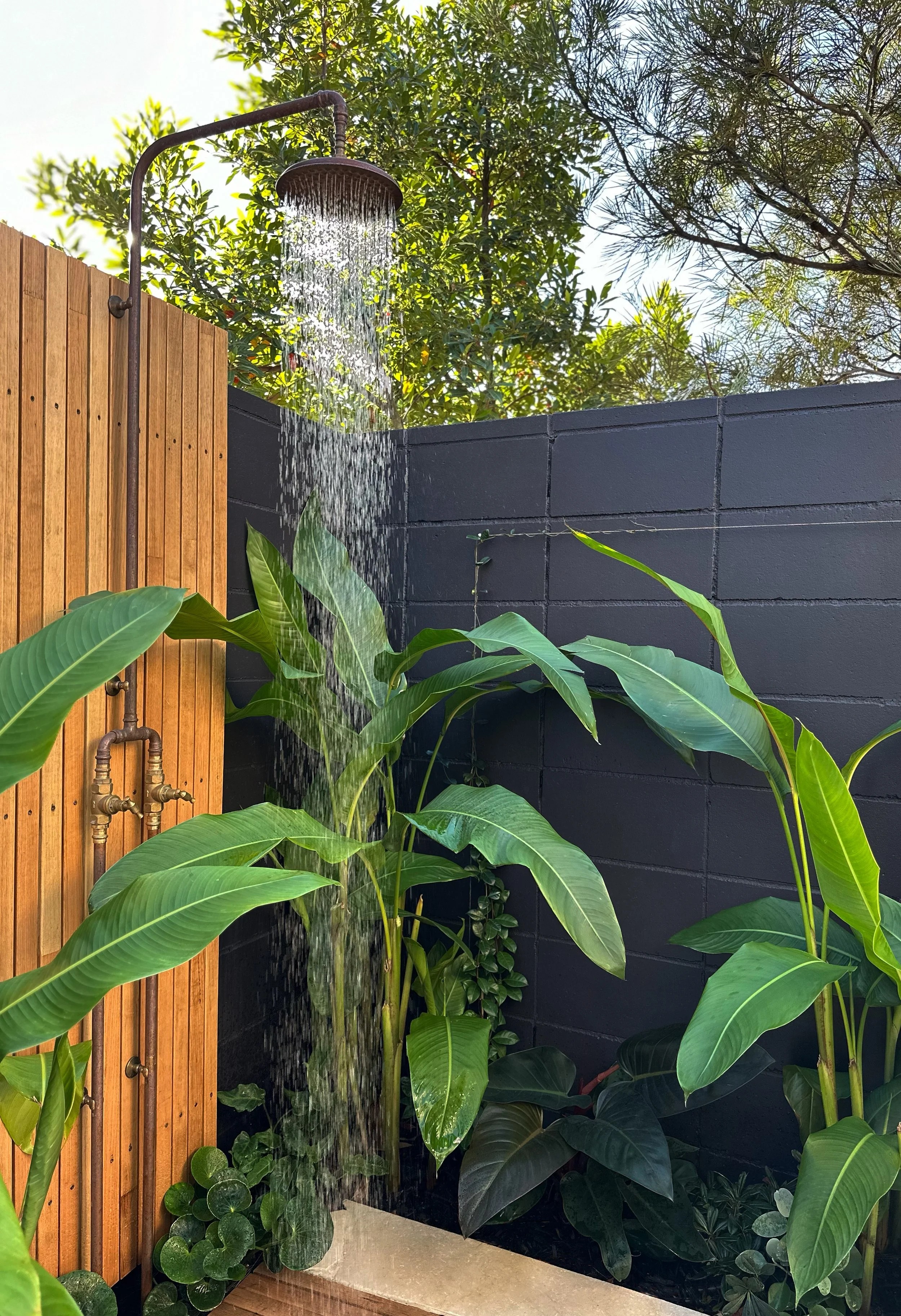 In the coastal suburb of Thirroul, this front entrance courtyard transformation balances relaxation with practical family functionality. The owners sought a space where parents could unwind while accommodating their beach-loving children's lifestyle. The design response creates a tropical sanctuary with large Heliconia plantings that cleverly enclose the space and conceal an existing wall. Dark green understory foliage establishes depth through layering, creating a sense of discovery and seclusion. The space now serves as a private retreat for relaxation and an afternoon gin and tonic surrounded by tropical plantings, with the view completed by a glimpse of the dramatic escarpment backdrop. An outdoor shower provides a practical touch for sandy returns from the beach, blending utility with beauty in this coastal family oasis.